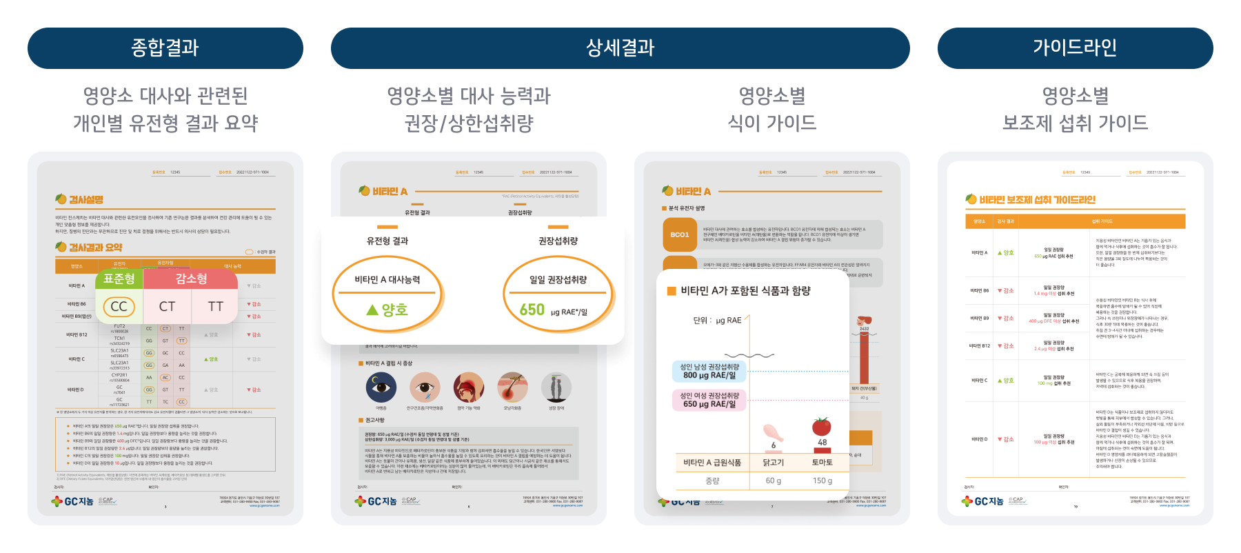 - 비타민 A: 시력, 면역 기능에 중요한 역할을 하는 비타민으로, 관련 유전자 분석을 통해 비타민 A의 대사 효율을 알 수 있습니다.