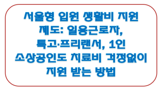 서울형 입원 생활비 지원 제도는 질병이나 부상으로 입원 치료가 필요한 서울 거주 일용근로자, 특수고용직, 프리랜서, 1인 소상공인 등 경제적으로 취약한 계층에게 생활비 지원을 제공하는 제도입니다. 입원 중에 발생하는 생활비 부담을 덜어주기 위해 서울시는 생활임금을 지원하며, 입원뿐만 아니라 입원 연계 외래진료와 공단일반건강검진 기간에도 지원이 이루어집니다. 이 제도는 치료를 받으면서 경제적인 부담을 덜고, 보다 원활하게 치료와 회복에 집중할 수 있도록 돕는 목적을 가지고 있습니다.