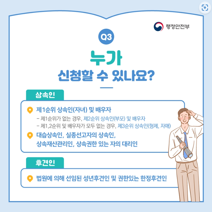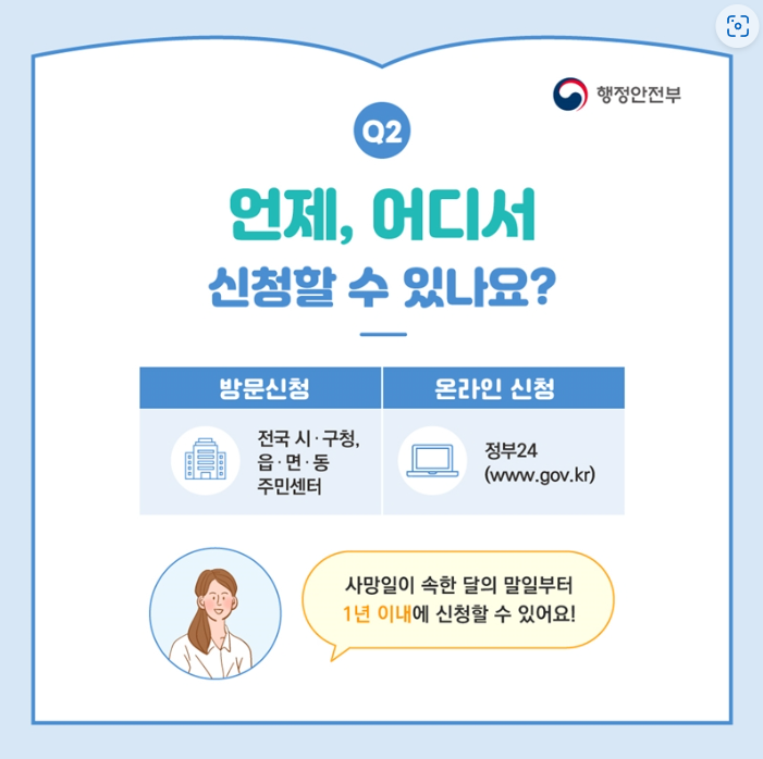 | 상속인 | 사망신고와 함께 신청시 방문: 사망자 주소지 동주민센터 또는 전국 시·구청,읍·면사무소 사망신고 이후 별도 신청 시 방문: 전국 시·구청,읍·면 ·동 주민센터 온라인: 정부24(www.gov.kr) - 민원서비스 > 원스톱서비스 |
