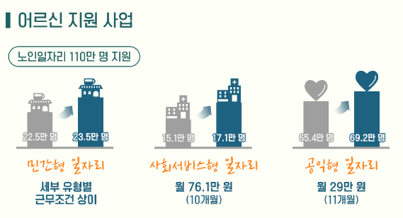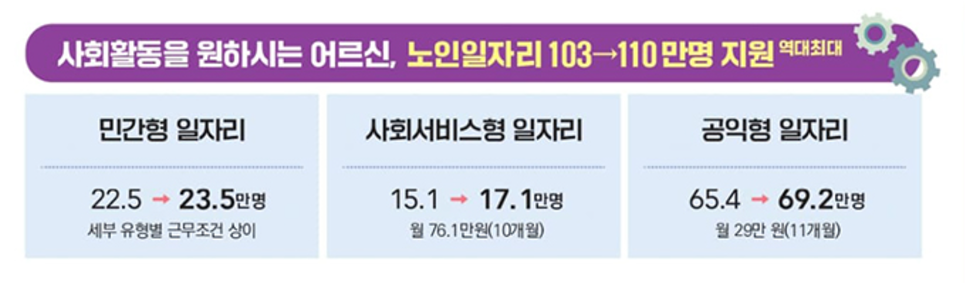 - 민간형 일자리: 23.5만 개로, 약 1만 개가 늘어납니다. 민간기업과의 협력을 통해 노인들이 다양한 일자리 기회를 가질 수 있습니다.
