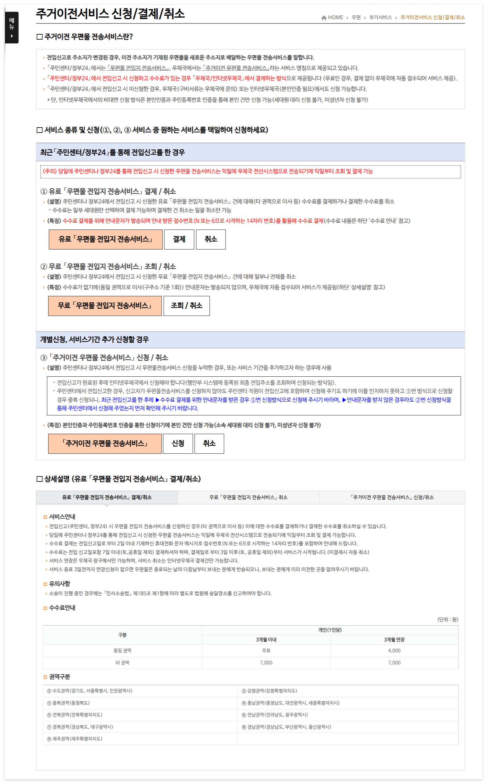 - 서비스 기간: 우편물 전송 서비스는 최대 1년 동안만 제공되므로, 1년 이후에는 새 주소로 우편물이 자동 전송되지 않습니다. 1년 후에는 우체국에 재신청하거나, 새 주소로의 우편물 수령 방법을 다시 정해야 합니다.