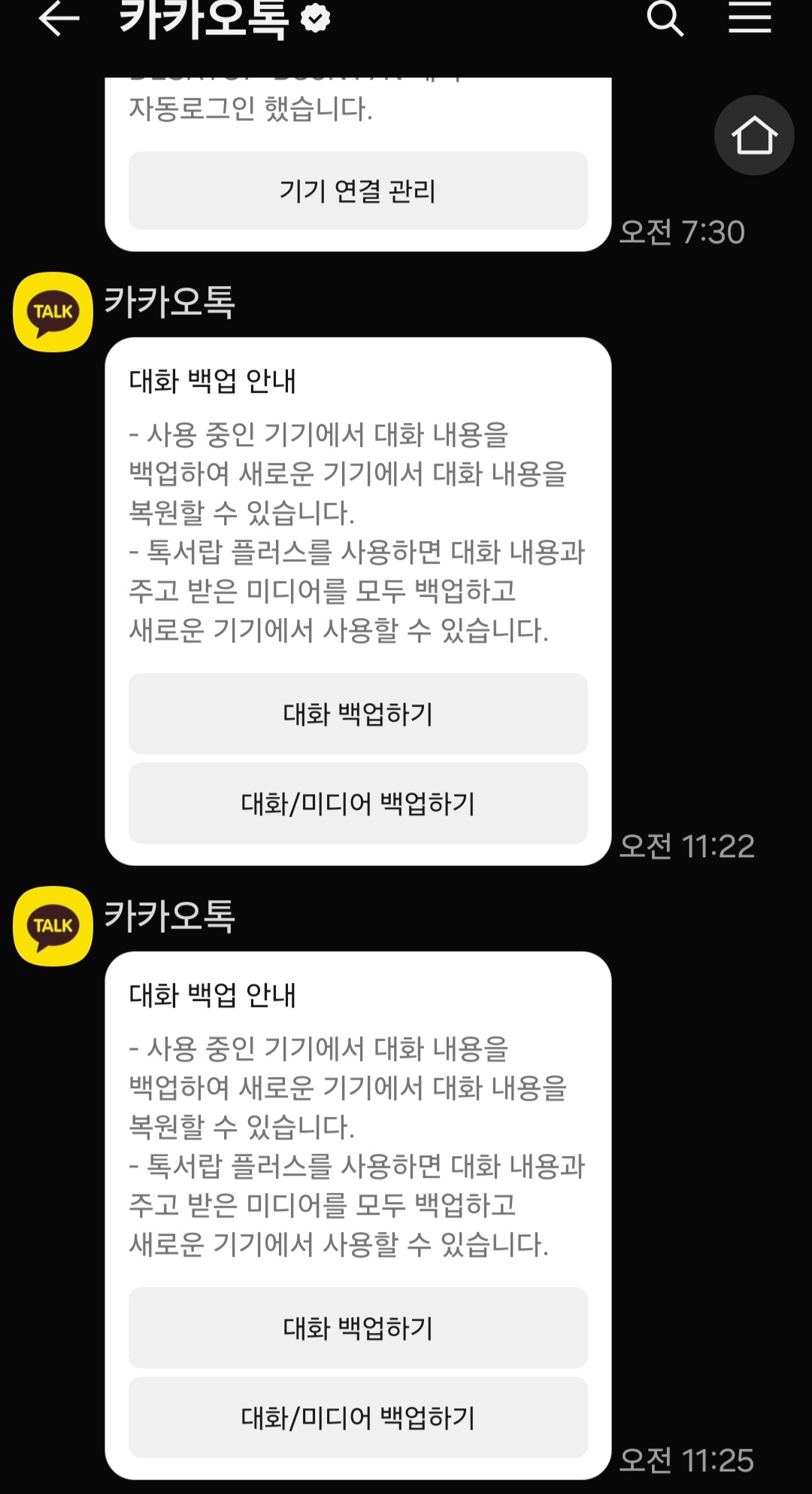 - 백업 용량 초과 시 ‘톡서랍 플러스’ 안내 해결법
