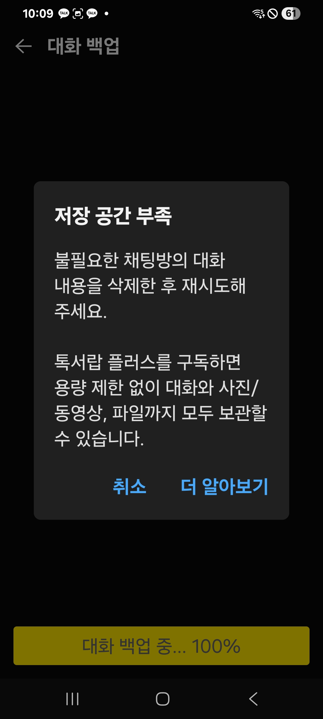 6. 백업 용량 초과로 ‘톡서랍 플러스’ 안내가 뜰 때 대처법