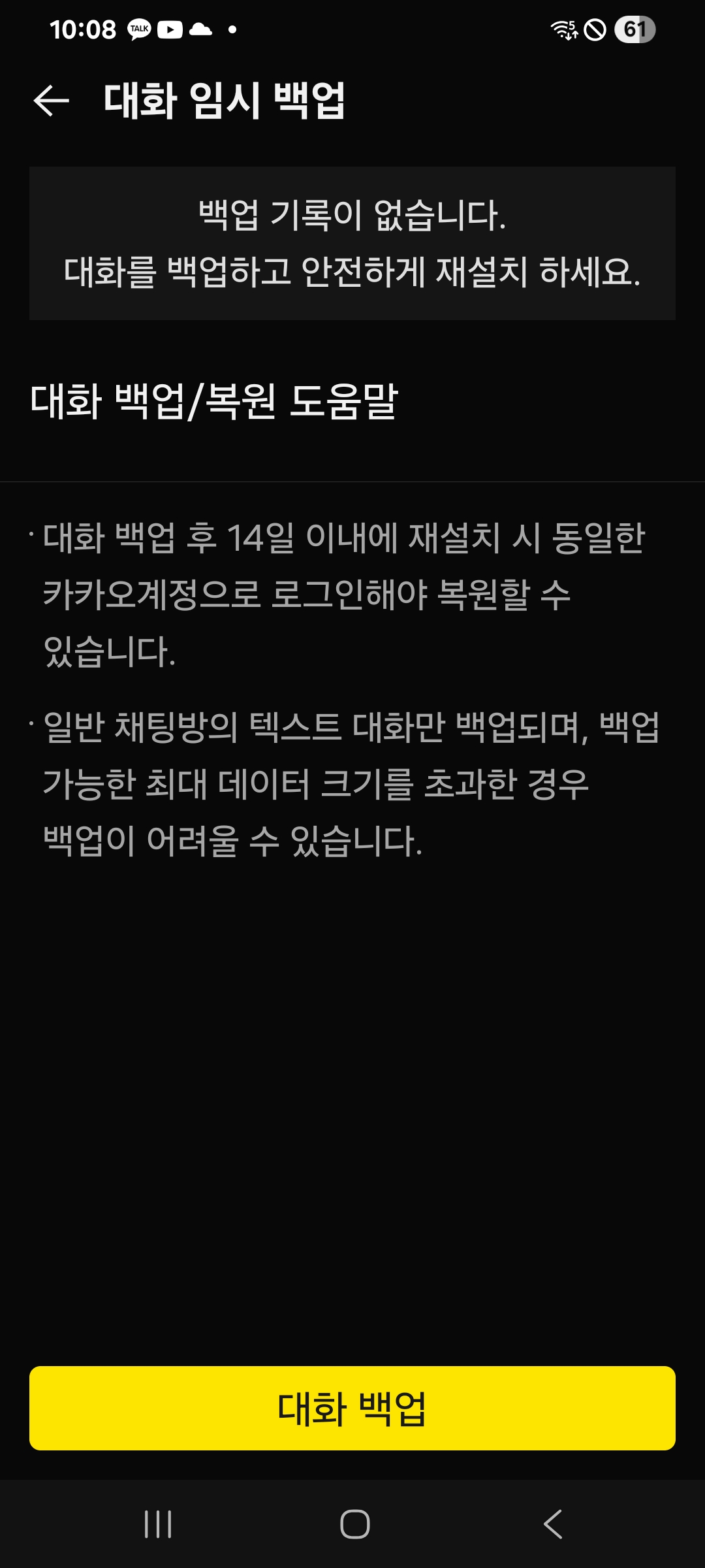 - 대화 백업 파일은 14일 이내만 복원 가능