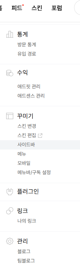 - 티스토리 로그인 → 왼쪽 [꾸미기] > [사이드바] 클릭