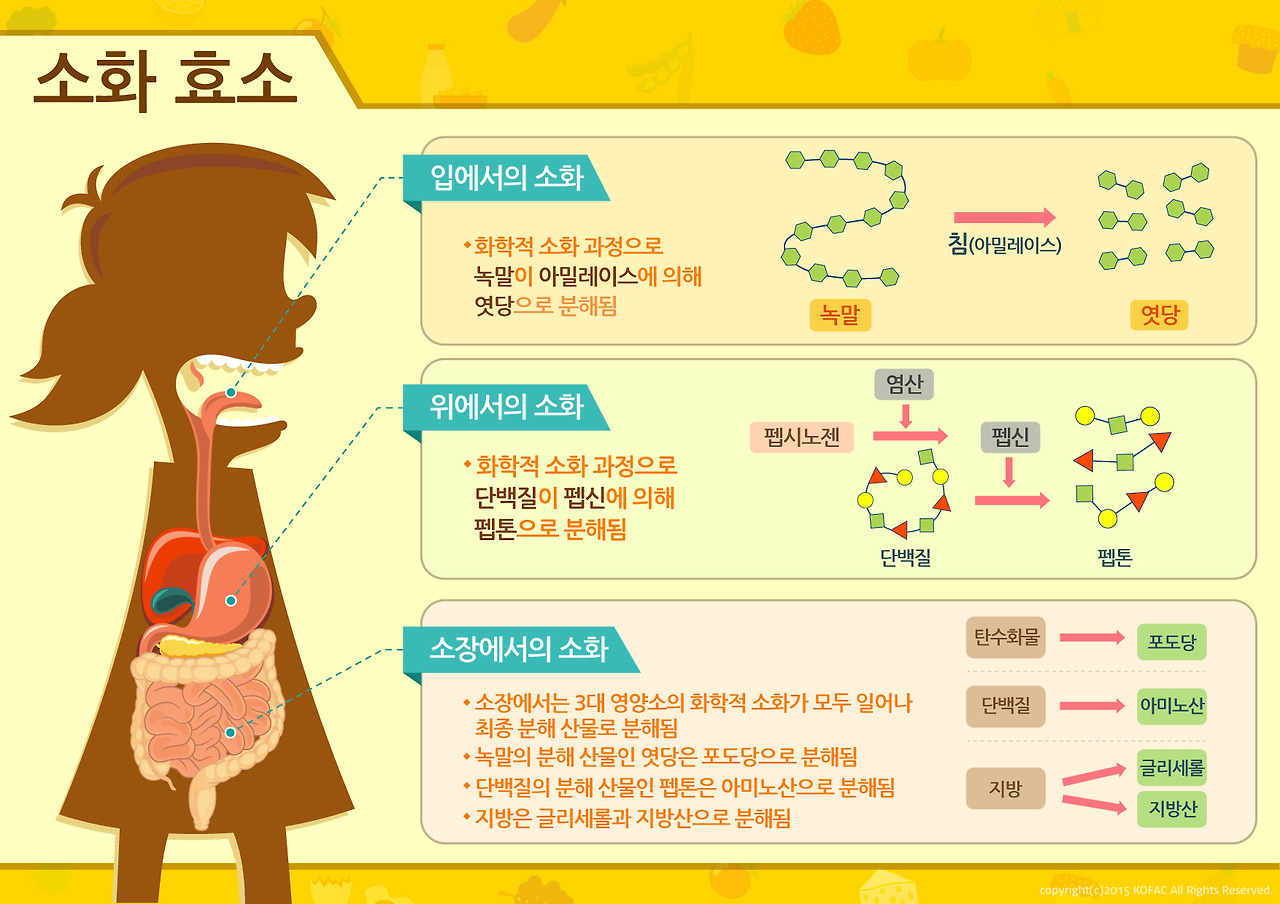 - 소화 효소 – 아밀라아제(탄수화물 분해), 프로테아제(단백질 분해), 리파아제(지방 분해)