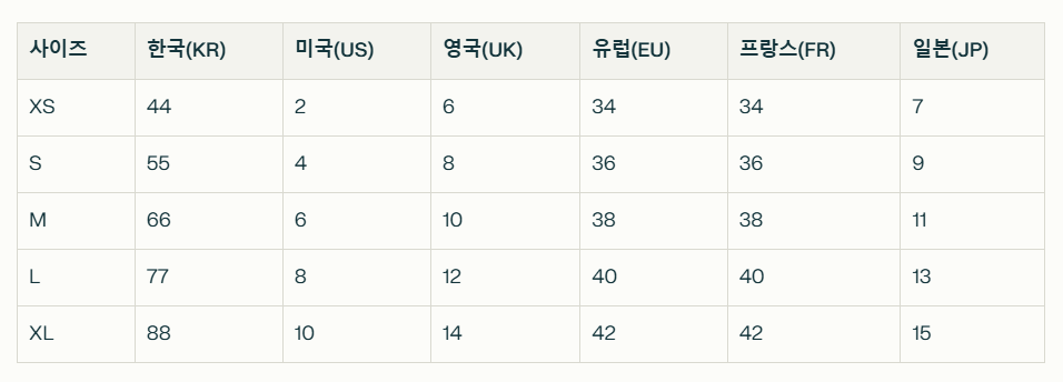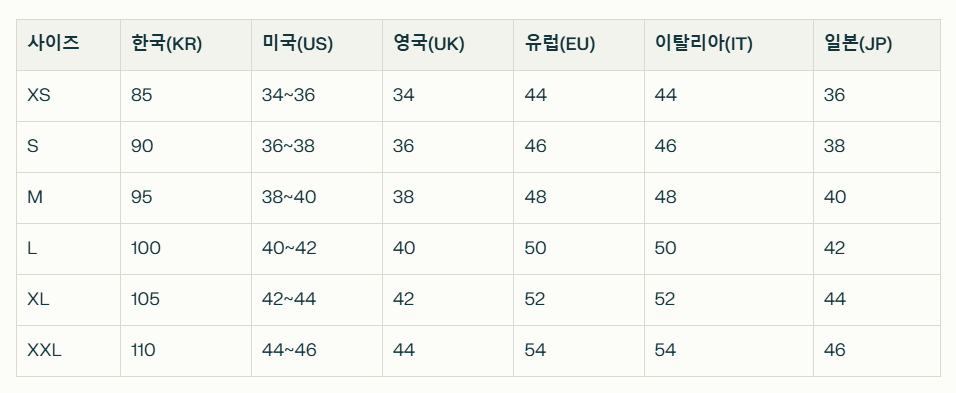 | 🇪🇺 유럽(EU/FR/IT) | 여성: 34, 36, 38 / 남성: 44, 46, 48 |