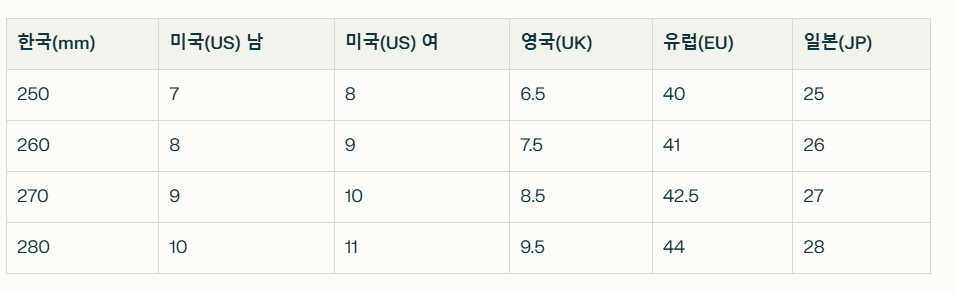 신발은 발볼 너비(Wide/B/D/EE) 도 중요하니 꼭 함께 확인하세요.