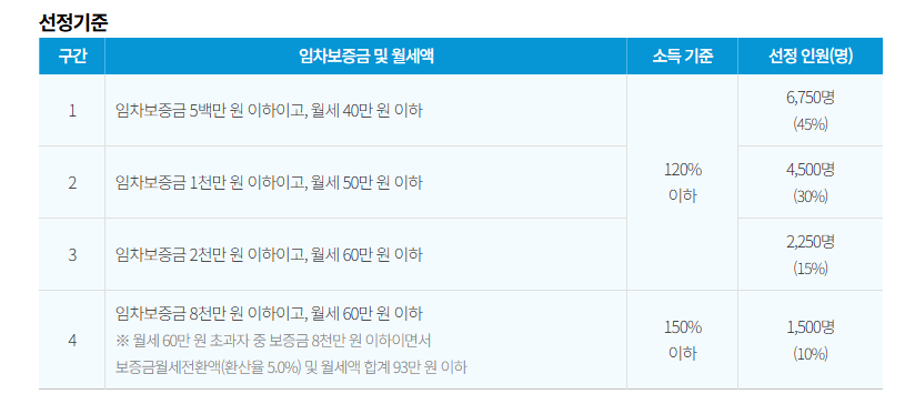- 전체 선정 인원의 75%를 보증금·월세가 낮은 구간에 집중 배정