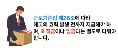 - 근로기준법 제26조에 따라, 해고의 효력 발생 전까지 지급해야 하며, 퇴직금이나 임금과는 별도로 다뤄야 합니다.